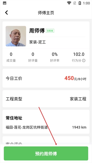 在师傅主页查看其信息后,点击【预约周师傅】按钮,即可发起对该师傅的预约。