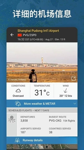 轻触机场图标,就能查看航班的到达与起飞时刻表、实时状态、地面停靠飞机信息、当前延误统计数据以及天气状况。