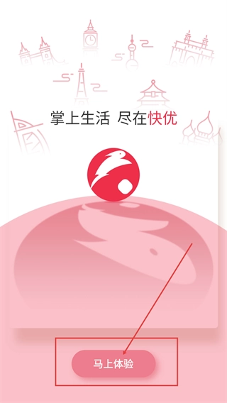 快优拼是一款主打拼团购物的生活服务类应用,其引导页核心规则为“拼中即可购买商品,未拼中则能获得平台豪礼”,用户点击【马上体验】按钮即可开启使用。
