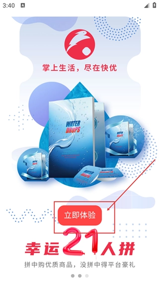 在“幸运21人拼”活动引导页面,点击【立即体验】按钮,即可进入应用首页;首页设有三人拼、平台优选、超值爆款等拼团分类板块。