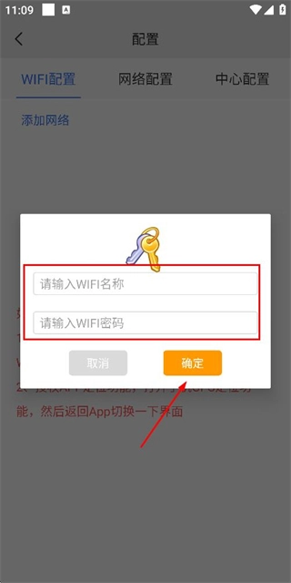 在输入框中填好WiFi的名称与密码,接着点击确定按钮,即可完成网络配置。