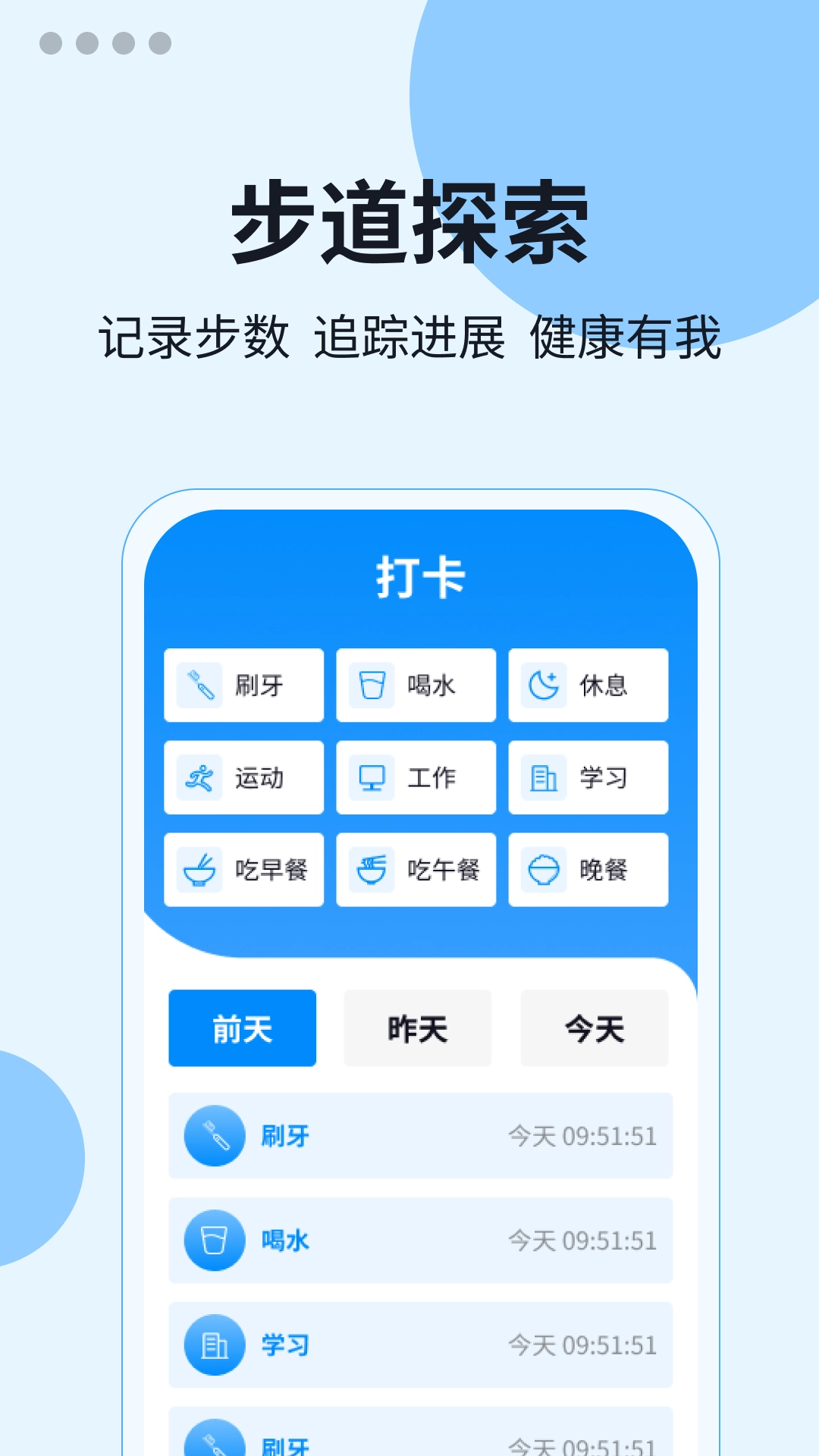 打卡功能可记录刷牙、喝水、学习、运动等日常行为,用户还能切换查看前天、昨天与今天的记录。