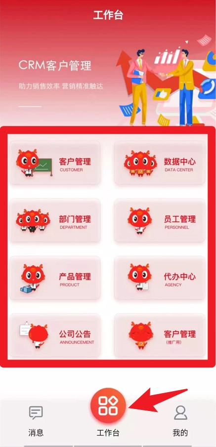 在工作台页面,你能够直观地看到客户管理、数据中心、部门管理、员工管理等模块,从而快速进入对应的功能进行操作。