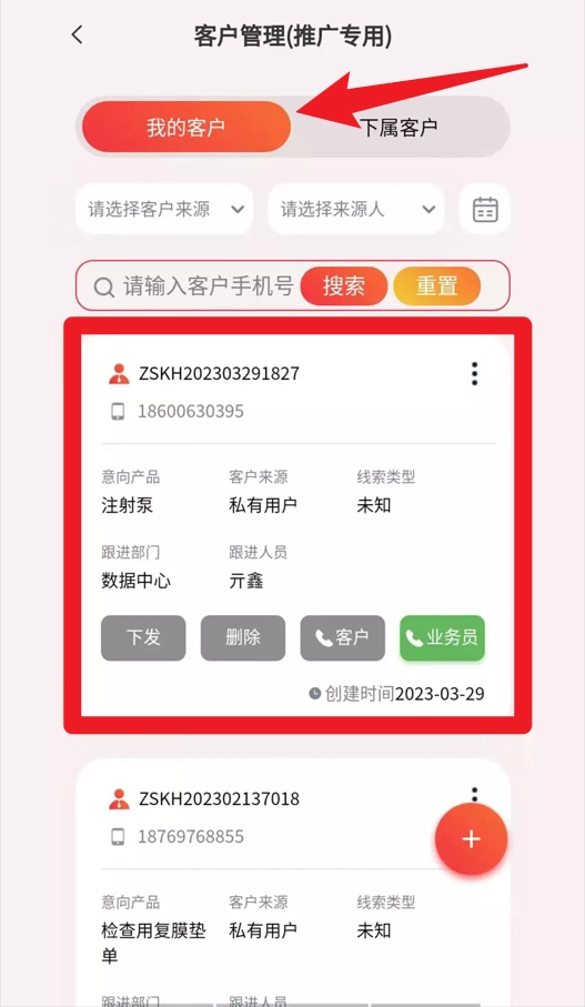 客户管理界面支持查看本人及下属客户,同时可借助搜索与筛选功能快速锁定目标客户,从而提高工作效率。