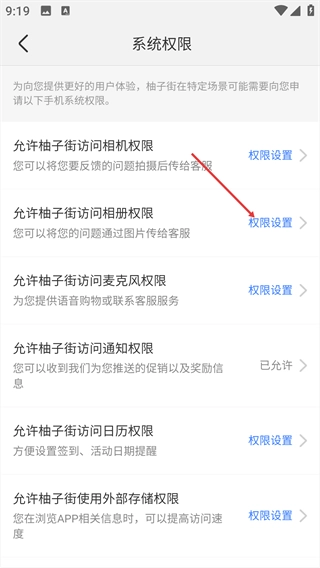 找到【允许柚子街访问相册权限】所对应的【权限设置】入口,然后点击它。