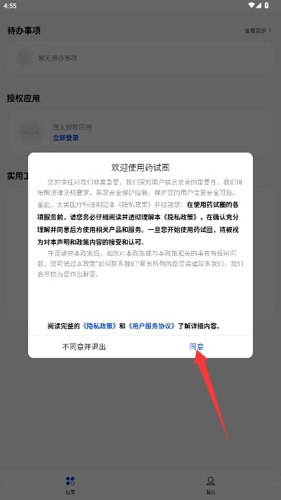 首次使用前,请仔细阅读隐私政策与服务协议。若确认无异议,点击“同意”按钮即可进入申请流程。