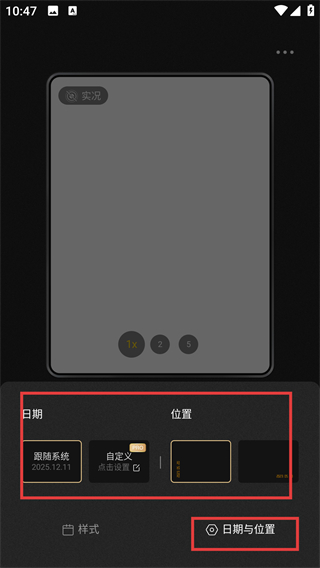 4、进入日期与位置设置页面,可选择【跟随系统】或自定义日期,根据需求调整后即可应用到拍摄中。