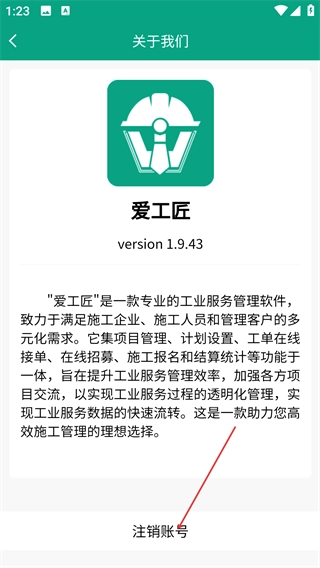 在【关于我们】页面,能够了解“爱工匠”(工业服务管理软件)的功能定位,也可以点击【注销账号】来完成账号注销操作。