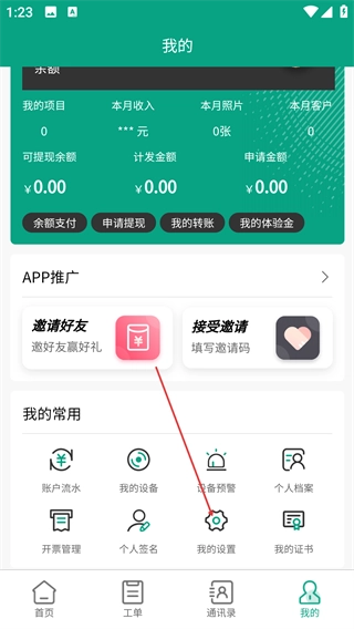 在【爱工匠】首页点击底部的【我的】按钮,就能进入个人中心页面,在这里可以查看账户信息以及各类功能入口。