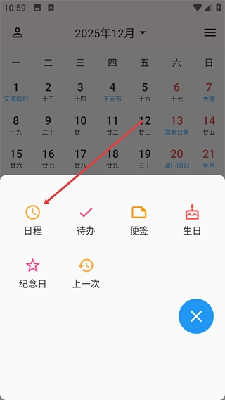 在日历应用的主界面,点击右下角那个蓝色的【+】按钮,就能弹出功能选择菜单,这个菜单可以用来添加日程、待办之类的事项,与此同时,界面上还会显示当天的黄历信息。