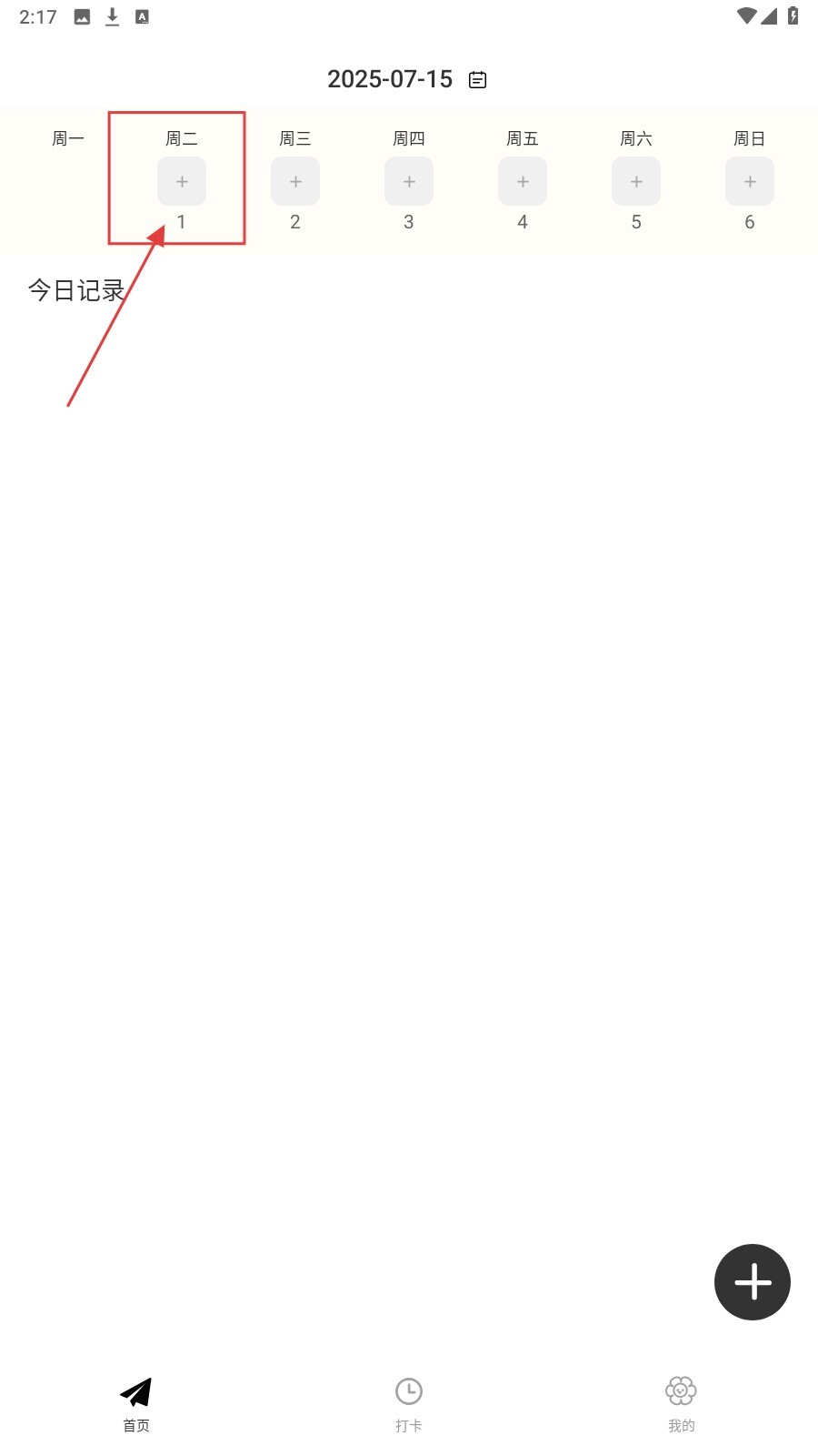1、打开应用后,点击日期选择区域,挑选需要记录的日期,例如【周二-1】。