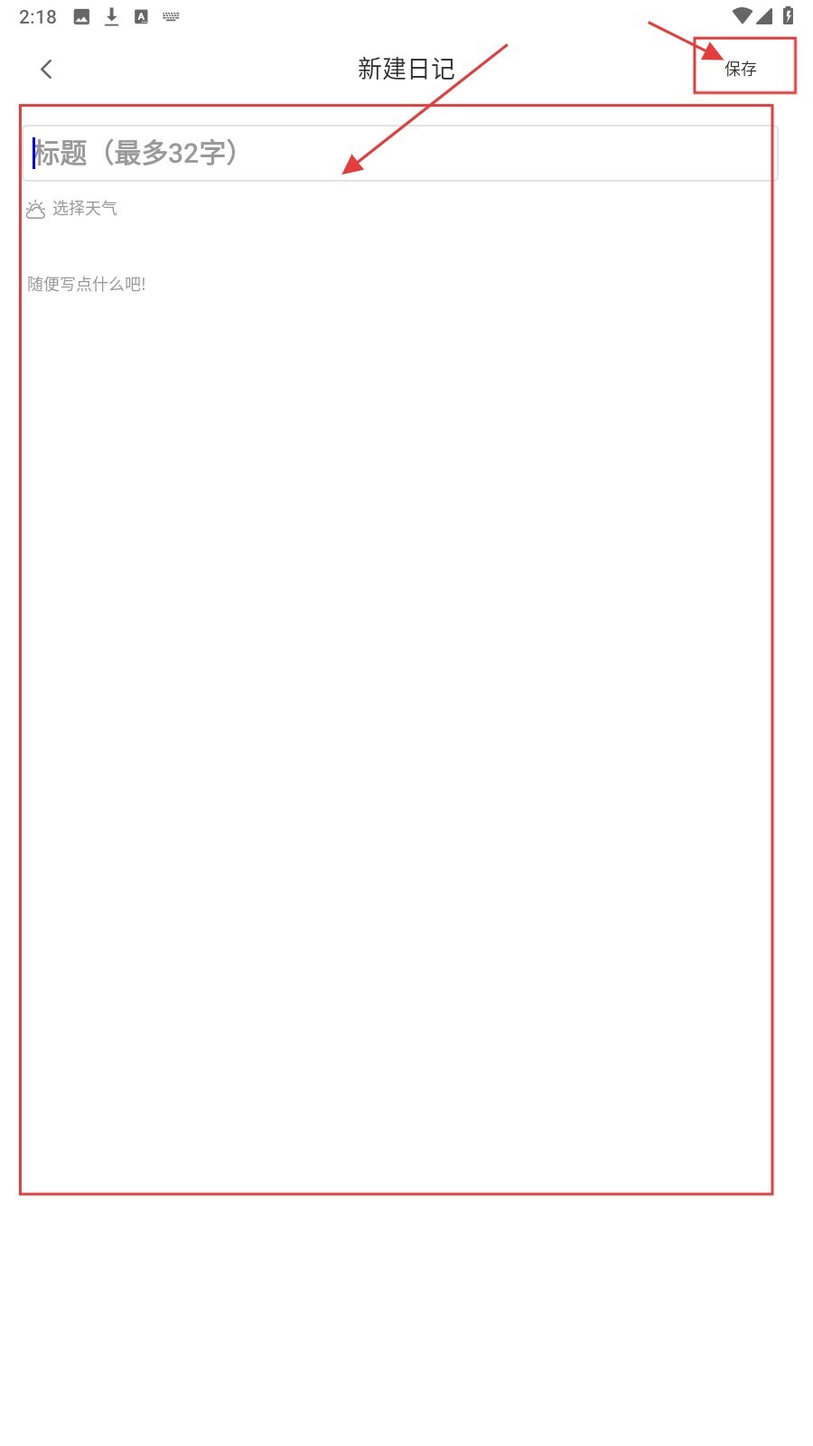 4、进入日记编辑页面后,填写好日记的标题与内容,接着点击【保存】按钮,这样就完成了日记的记录。