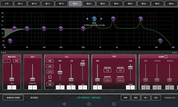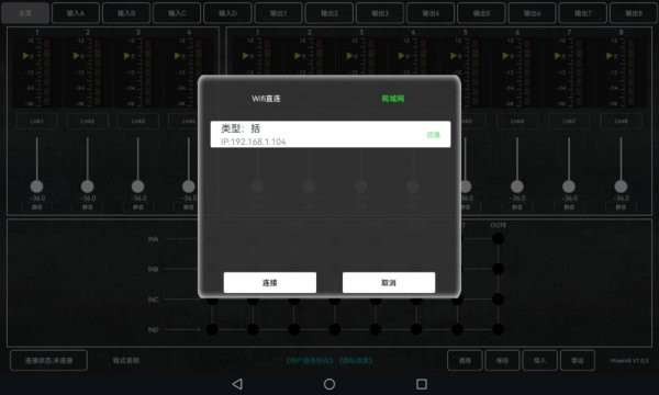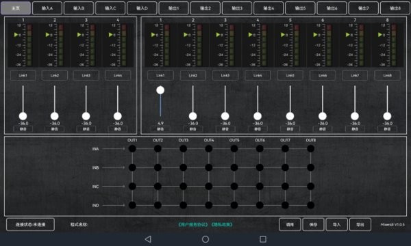 Mixer48最新版支持本公司的专业音频处理器,DX系列Wifi直连,以及DSP,DAP局域网搜索设备连接。实时查看设备各个参数,控制各通道音量调节、输入输出路由配置、输入输出通道EQ、延时等参数,以及场景模式调用、保存导入导出等功能。