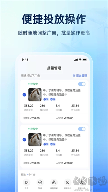 3、投放调整:可随时更改投放状态、出价金额与预算设置,还能灵活调整投放时间、投放策略及目标人群,即便没有电脑,也能随时对广告投放进行优化。