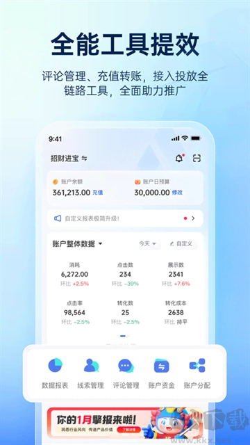 1、数据监测:可随时查看广告与账户的实时数据及历史数据,以便快速掌握投放效果;