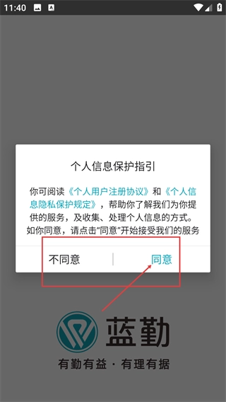 在使用蓝勤之前,您需要先阅读《个人用户注册协议》,知悉其中关于信息处理的相关内容,之后点击“同意”按钮即可进入服务。