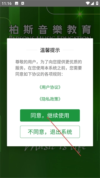 当弹出【温馨提示】窗口时,请先阅读其中的【用户协议】和【隐私政策】,随后点击【同意,继续使用】按钮,就能进入下一步的操作界面了。