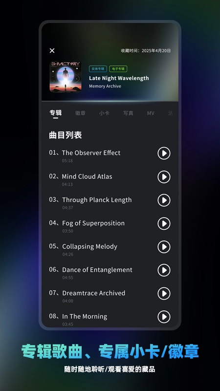 可以一键添加并整理电子专辑、小卡、徽章等各类藏品,轻松打造专属于你的音乐收藏馆,方便随时查看与管理。