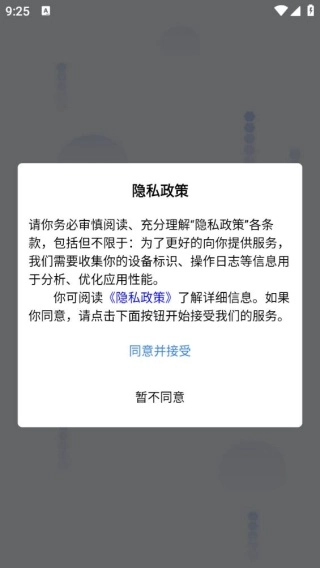 安装软件后打开,弹出隐私政策,点击同意并接受。