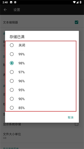 找到存储已满的选项,点击后打开存储已满的阈值选择弹窗。