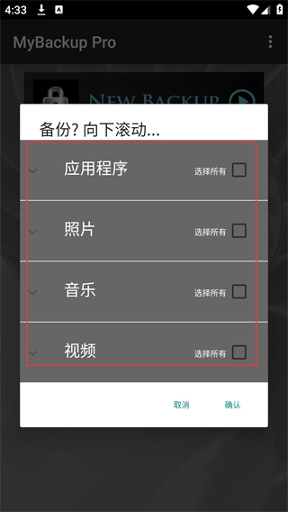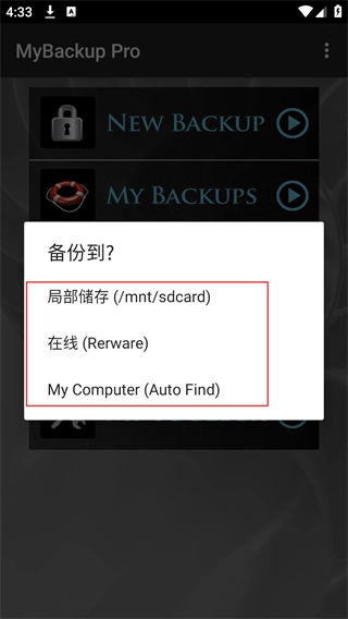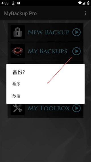打开MyBackupPro应用,进入主界面后点击【MYBACKUPS】选项,此时会弹出“备份?”的选择框。