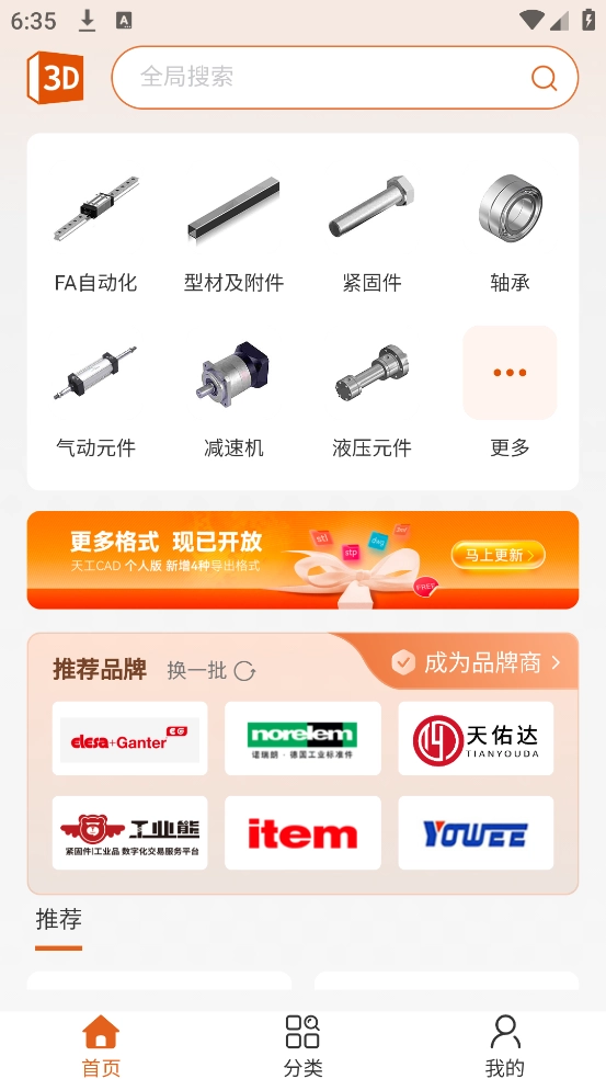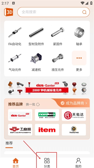 进入软件首页后,你可以借助【全局搜索】功能来查找物品,也能够点击【FA自动化】下的【型材及附件】等分类入口,还可以点击底部的【分类】按钮进行更细致的筛选。