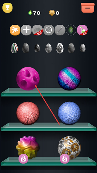 在道具选择界面,点击已解锁的球体(例如粉色球体),就能进入对应的互动玩法,界面上还会显示钻石、金币等资源以及各类功能按钮。