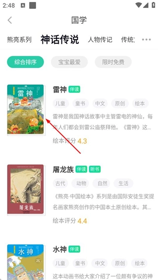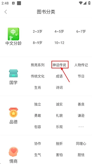 在图书分类页面,选择国学分类下的神话传说选项,即可进入对应的绘本列表页面。