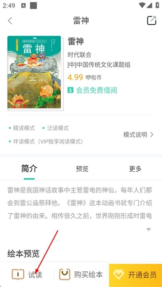 在绘本详情页,点击试读按钮就能开启该绘本的阅读。