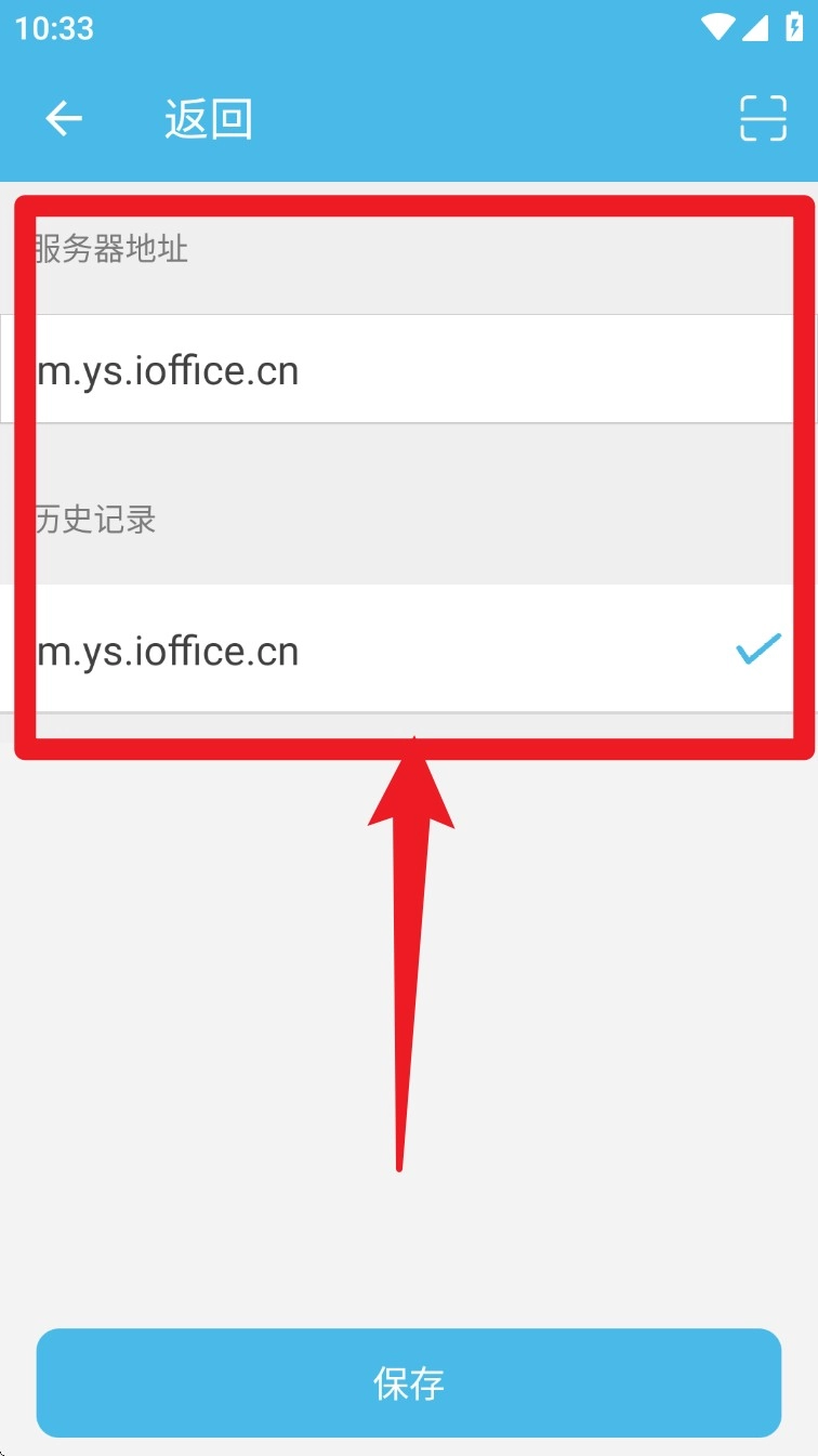 首次使用时需配置服务器地址,操作步骤为:点击右上角的高级设置,输入地址后点击保存即可。