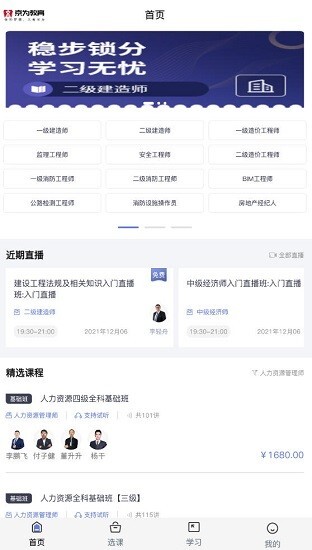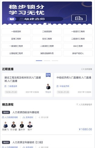 1. 课程学习:平台开设多门职业教学课程,覆盖建工、教资、医卫、财会、考研等不同领域,用户能够依据自身实际需求挑选课程进行学习。