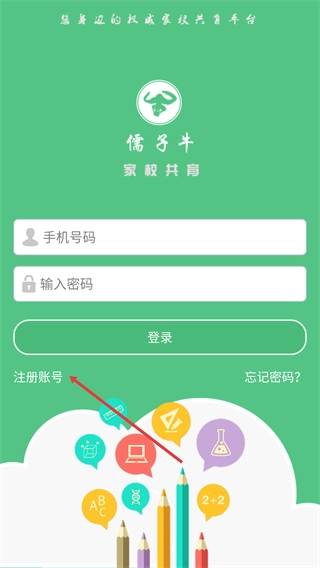 在孺子牛家校共育平台的登录页面,点击“注册账号”按钮即可开启注册流程。此平台主要用于家校协同教育,支持通过手机号加密码的方式进行登录。