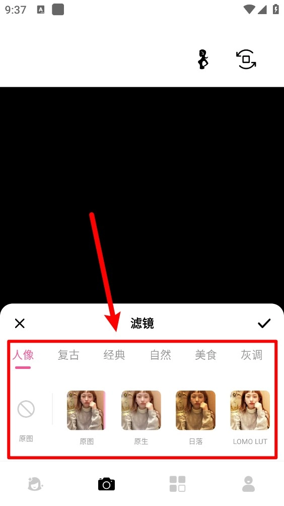 你可以依据自身需求挑选合适的滤镜,选好后点击对钩就能进行拍照了。