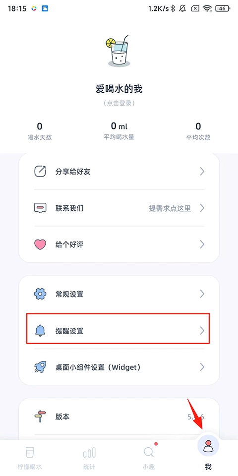 打开柠檬喝水应用,点击底部导航栏的【我】,进入个人中心页面后找到【提醒设置】选项并点击,在该页面中查看设置选项里包含的各项功能。