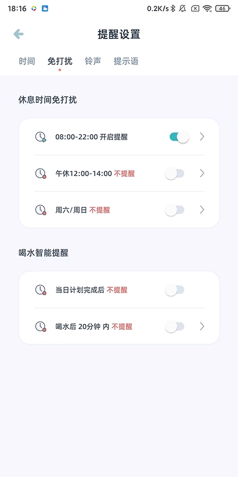 点击免打扰功能,还能关闭自定义时段的喝水提醒,这一设置细致到休息时间的每分每秒,让你不必担心因它而影响计划的顺利进行。