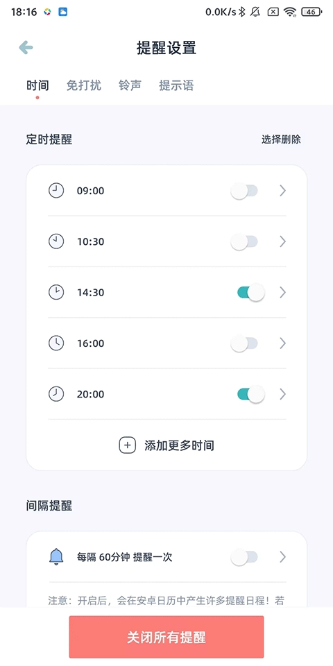 用户可以根据自身需求自定义设置时间提醒,也能够关闭所有提醒,以免干扰正常的生活与工作。