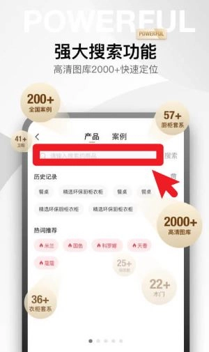 在首页点击搜索栏并输入关键词后,系统会迅速从2000+高清图库中匹配出相关的产品与案例内容。