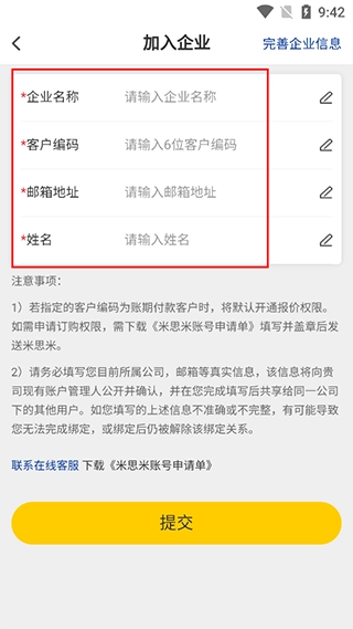 企业填写页面的示例如下,企业名称、客户编码、邮箱地址等信息都需要仔细填写完整。