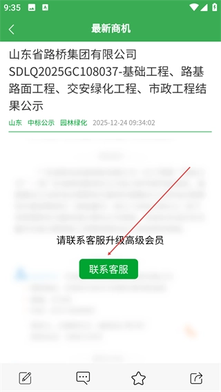 当查看部分商机详情时,若系统提示需要升级会员,您可以点击【联系客服】按钮,向客服咨询会员升级的相关事宜,从而获取完整的商机信息。