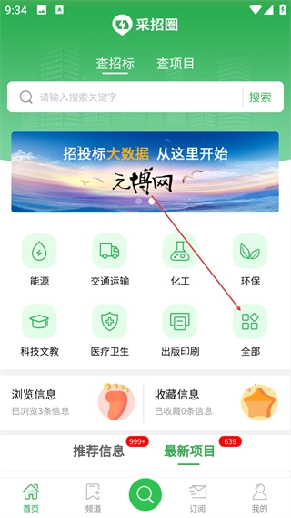 在【采招圈】首页,既能借助搜索框查找所需内容,也能点击【全部】按钮,进入行业选择界面来筛选对应领域的信息。