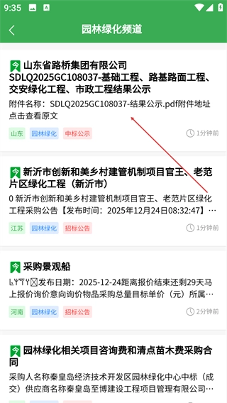 选定【园林绿化】分类后,进入对应的频道页面,就能浏览该行业范畴内的招标公告、中标公示等各类信息,点击具体的条目即可查看详细内容。