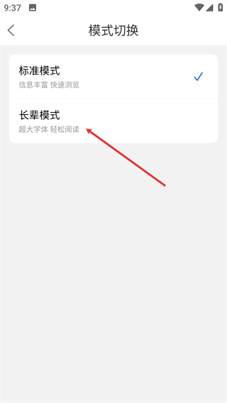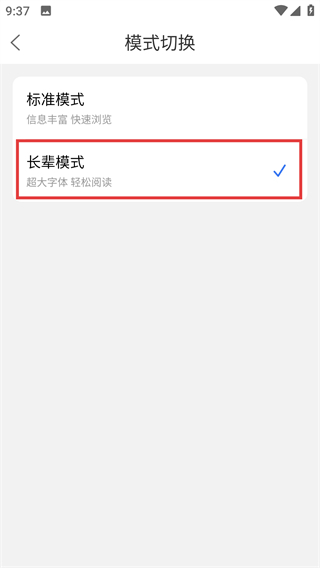 进入【模式切换】页面后,您可以选择【标准模式】(该模式信息丰富,便于快速浏览)或者【长辈模式】(此模式采用超大字体,让阅读更轻松),目前系统默认的是【标准模式】。