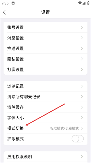 在【设置】页面中,您可以对【账号设置】-【消息设置】等功能进行操作;点击【模式切换】按钮,即可进入模式选择界面,此外还能开启【护眼模式】功能。
