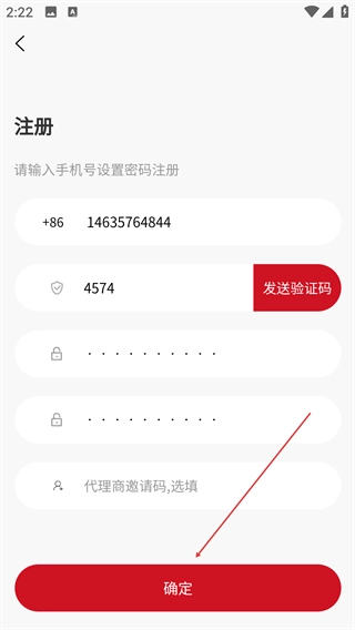 在注册页面,依次填写手机号、验证码和密码等必要信息,若有代理邀请码可自行选择填写,之后点击【确定】按钮,即可完成注册流程。