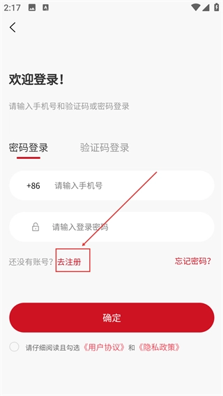 登录界面提供【密码登录】与【验证码登录】两种方式,要是还没有注册账号,点击【去注册】按钮就能进入注册页面。