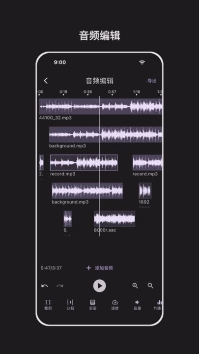 音频编辑功能包括:对多个音频进行混合与拼接,同时支持音频分割、剪切操作,还具备调整播放速度、设置淡入淡出效果、降噪处理、均衡器调节、修改音调以及调整音量等功能。