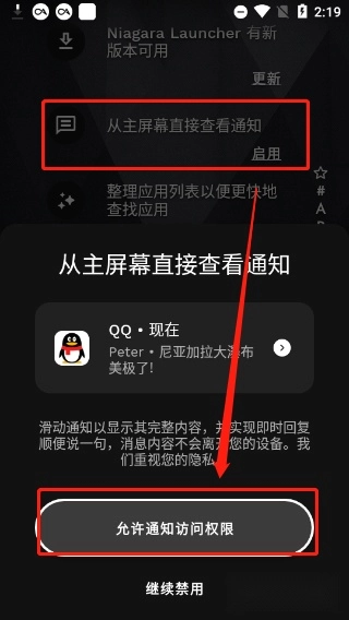 在弹出通知权限选择界面后,找到“niagara launcher”这一选项并点击允许。