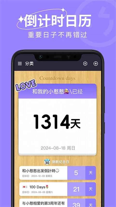 日历倒数日手机版是一款专业的日历倒数工具,能协助用户设置并管理生日、纪念日、考试、节假日等各类重要事件的倒计时。借助直观的界面与智能提醒功能,用户可更合理地规划时间,防止遗漏重要事项,从而提高生活和工作的效率。