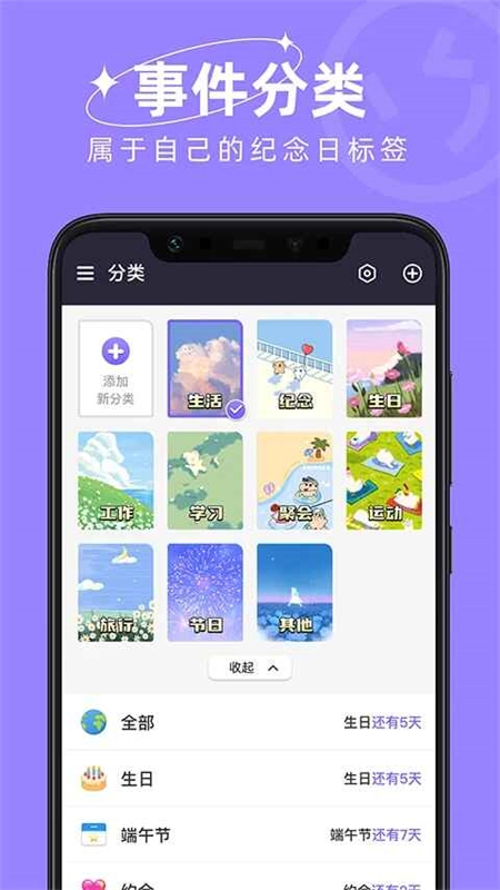 常用节假日倒计时模板,也支持用户手动添加自定义节日事件。