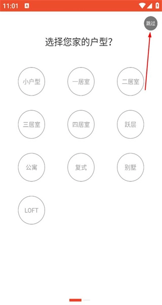 打开软件后,进入户型选择页面,浏览各类户型选项,点击跳过按钮,略过户型选择步骤。
